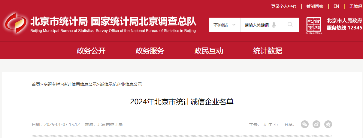 日前,北京市统计局公布了各区“2024年北京市统计诚信企业”。星空体育(以下简称“清新环境”)凭借扎实的统计工作基础、严谨的数据处理流程以及对诚信原则的坚守,在参选的400家单位中脱颖而出,成为11家获此殊荣的单位之一。这是清新环境首次获此殊荣。